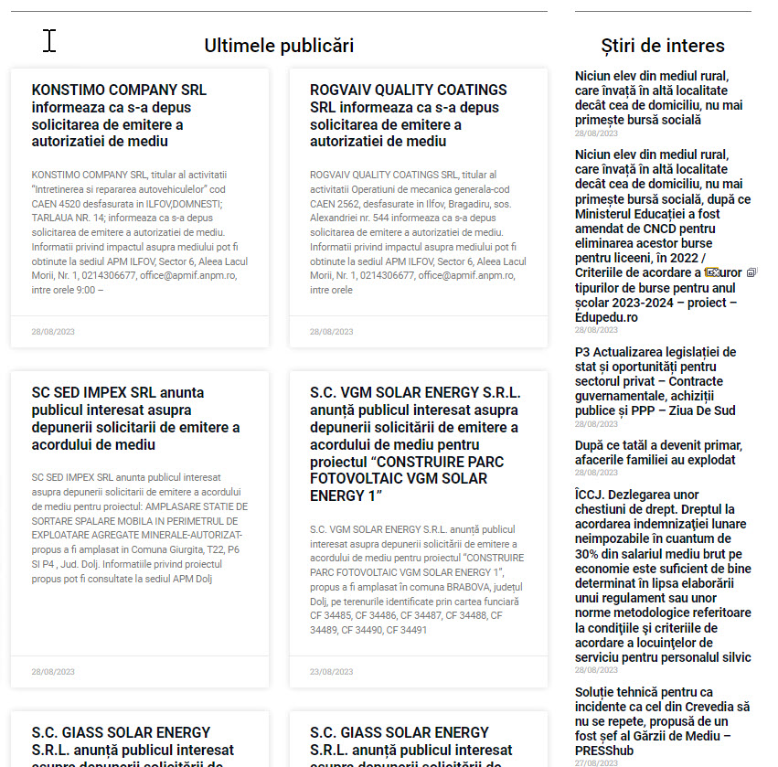 Indiferent că trebuie să publici solicitarea privind obținerea autorizației de mediu, a avizului de mediu sau a acordului de mediu, anunțurile tale se vor regăsi pe pagina noastră pentru o durată de cel puțin un an de zile.